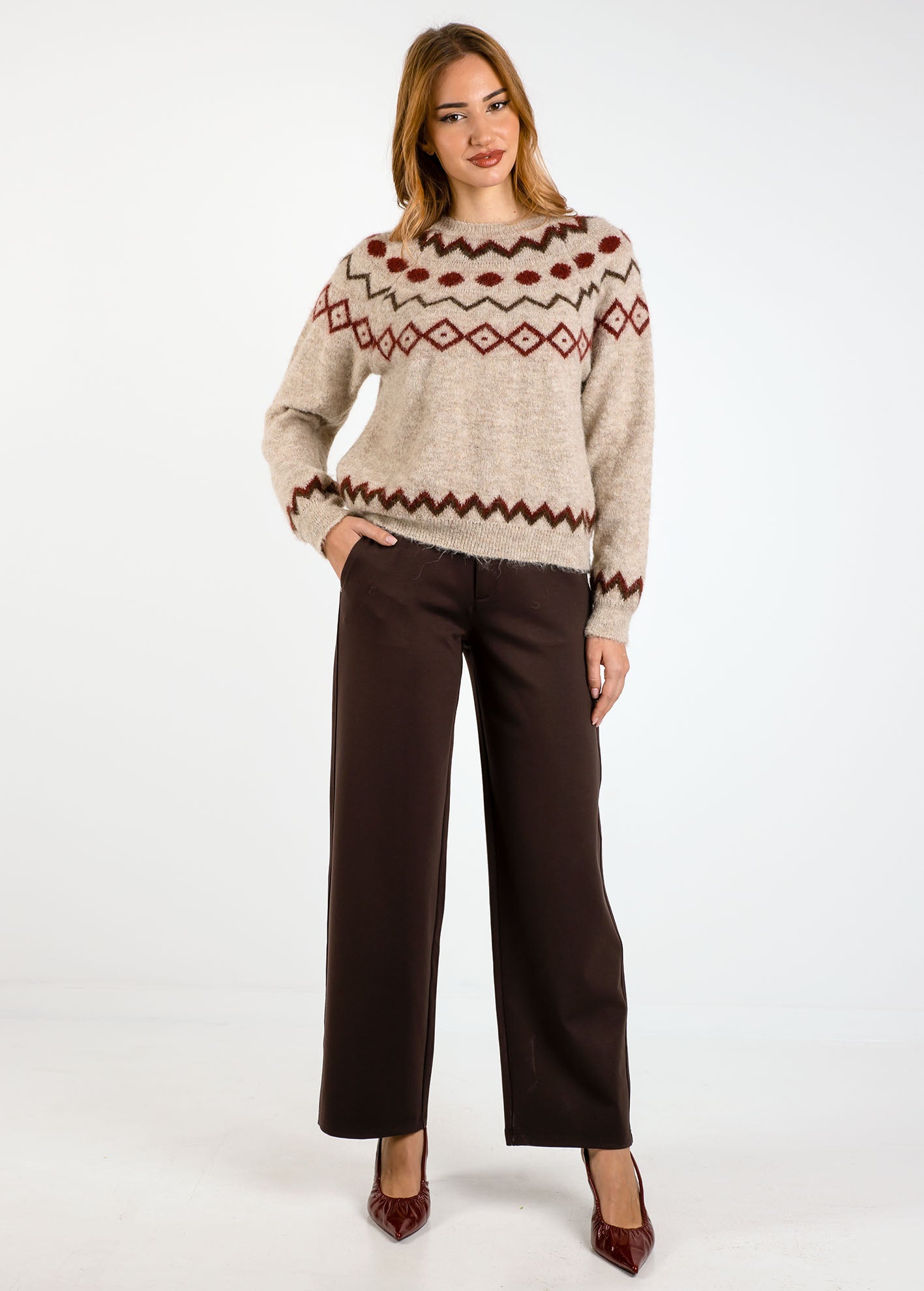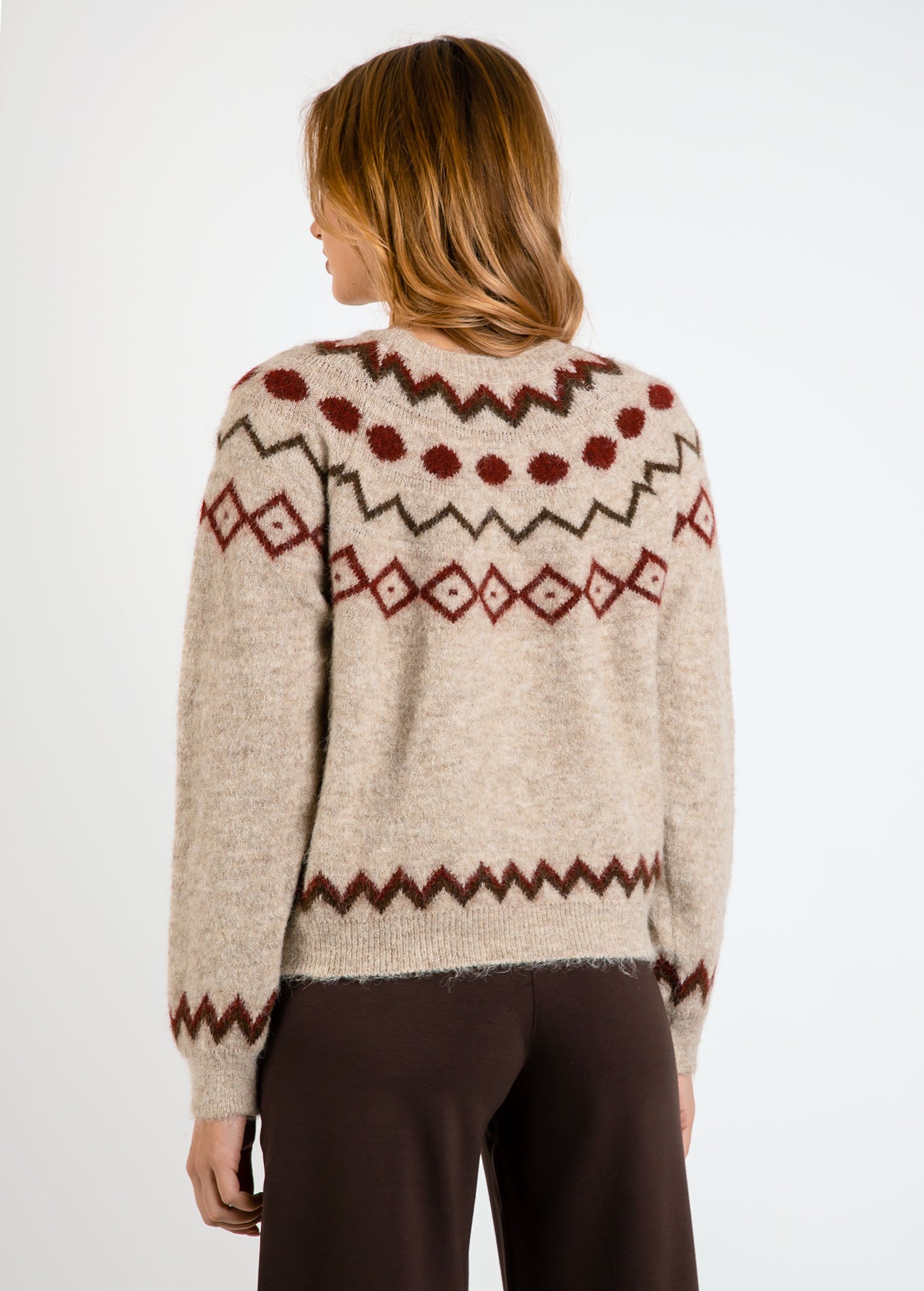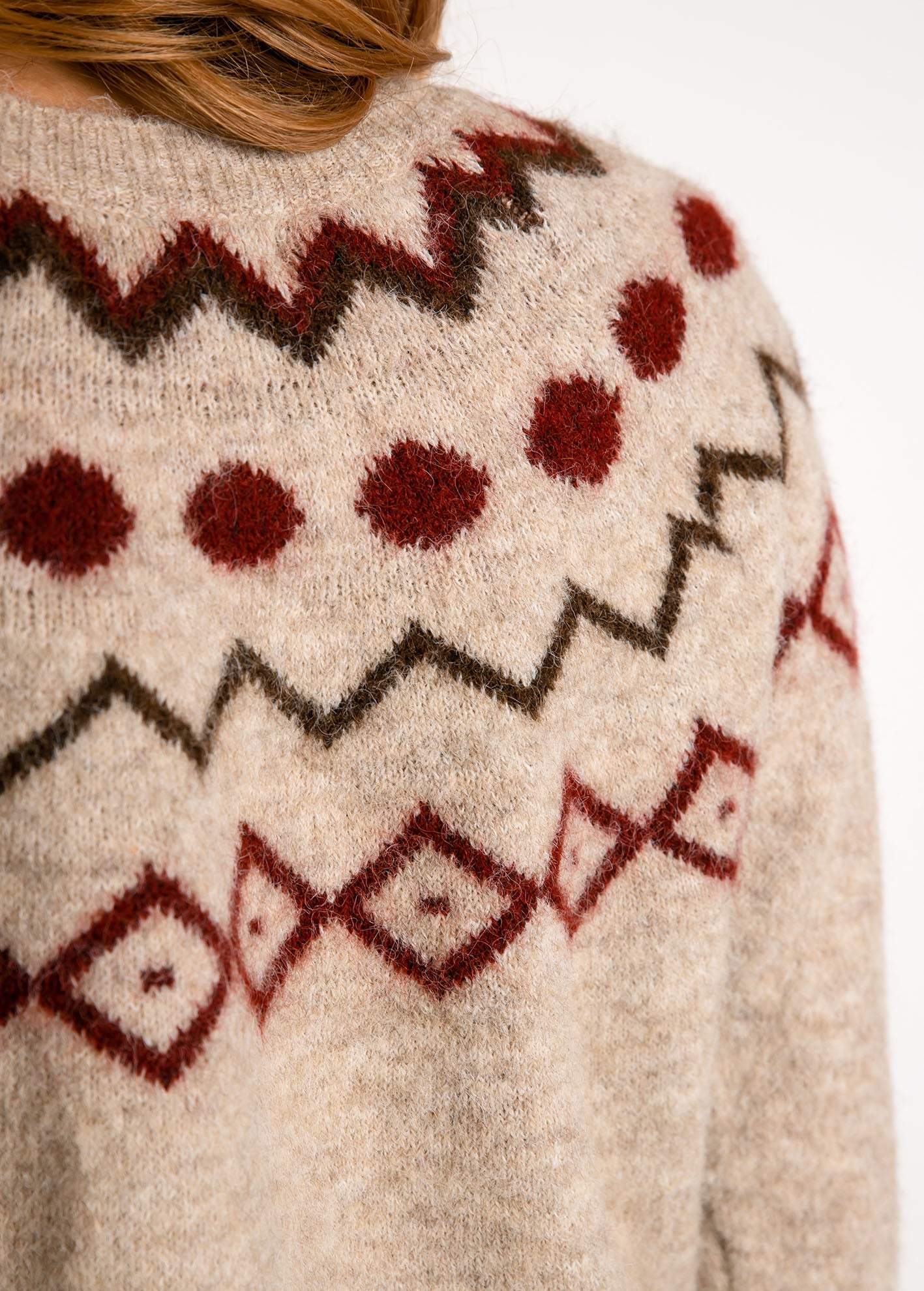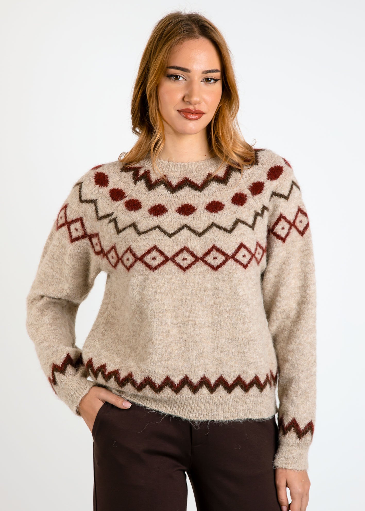 Πλεκτή μπλούζα με απαλή υφή σε μπεζ απόχρωση με γεωμετρικό μοτίβο σε μπορντό και καφέ χρώμα. Μακρύ μανίκι και στρογγυλή λαιμόκοψη.