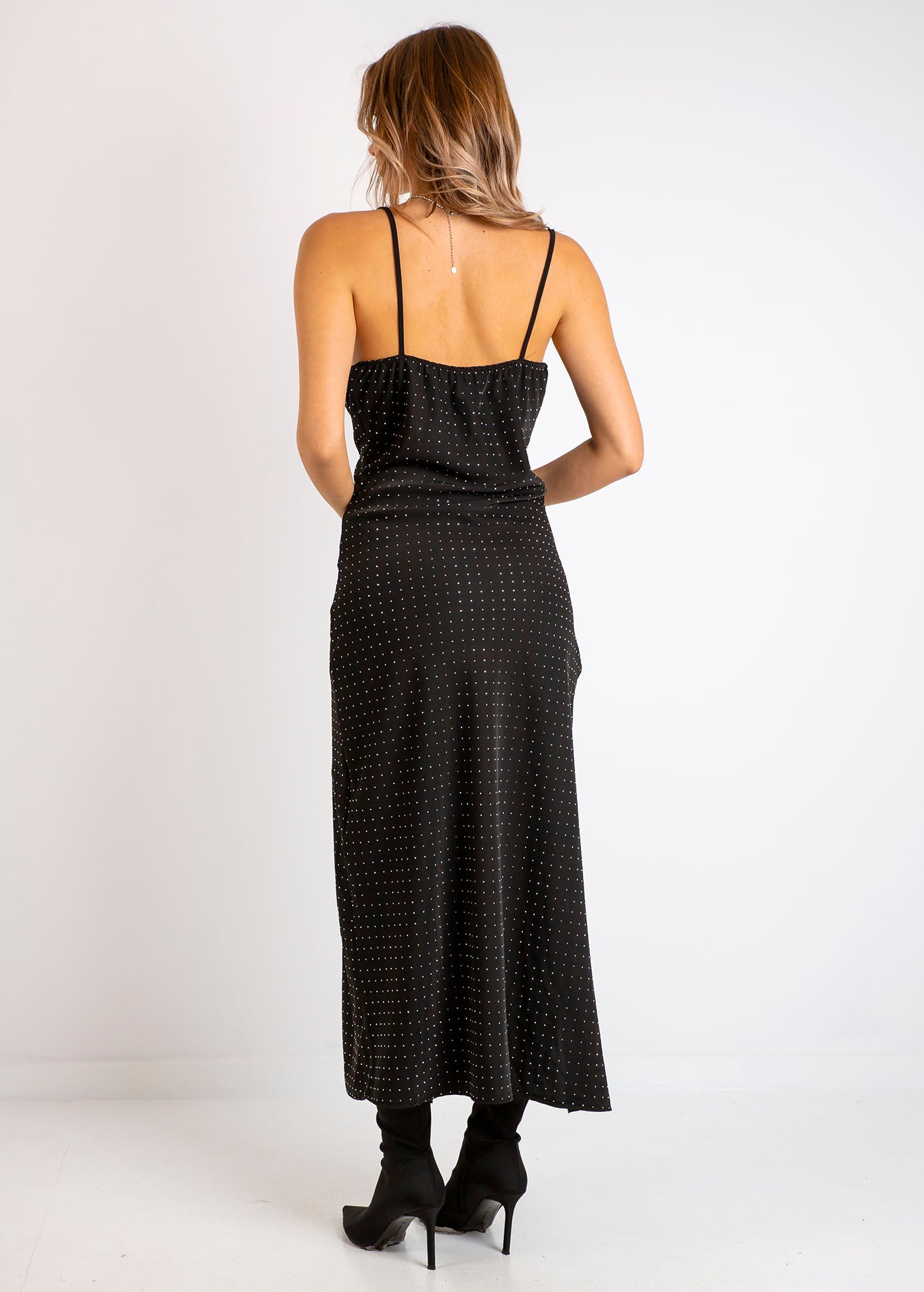 Μακρύ φόρεμα σε μαύρο χρώμα με λεπτές τιράντες, διακριτική γκλίτερ υφή και ίσια γραμμή που αγκαλιάζει το σώμα.