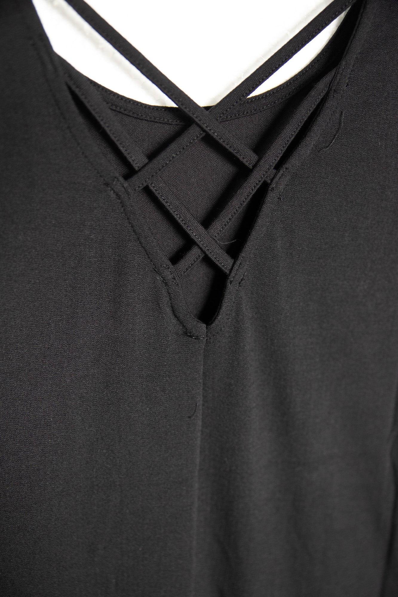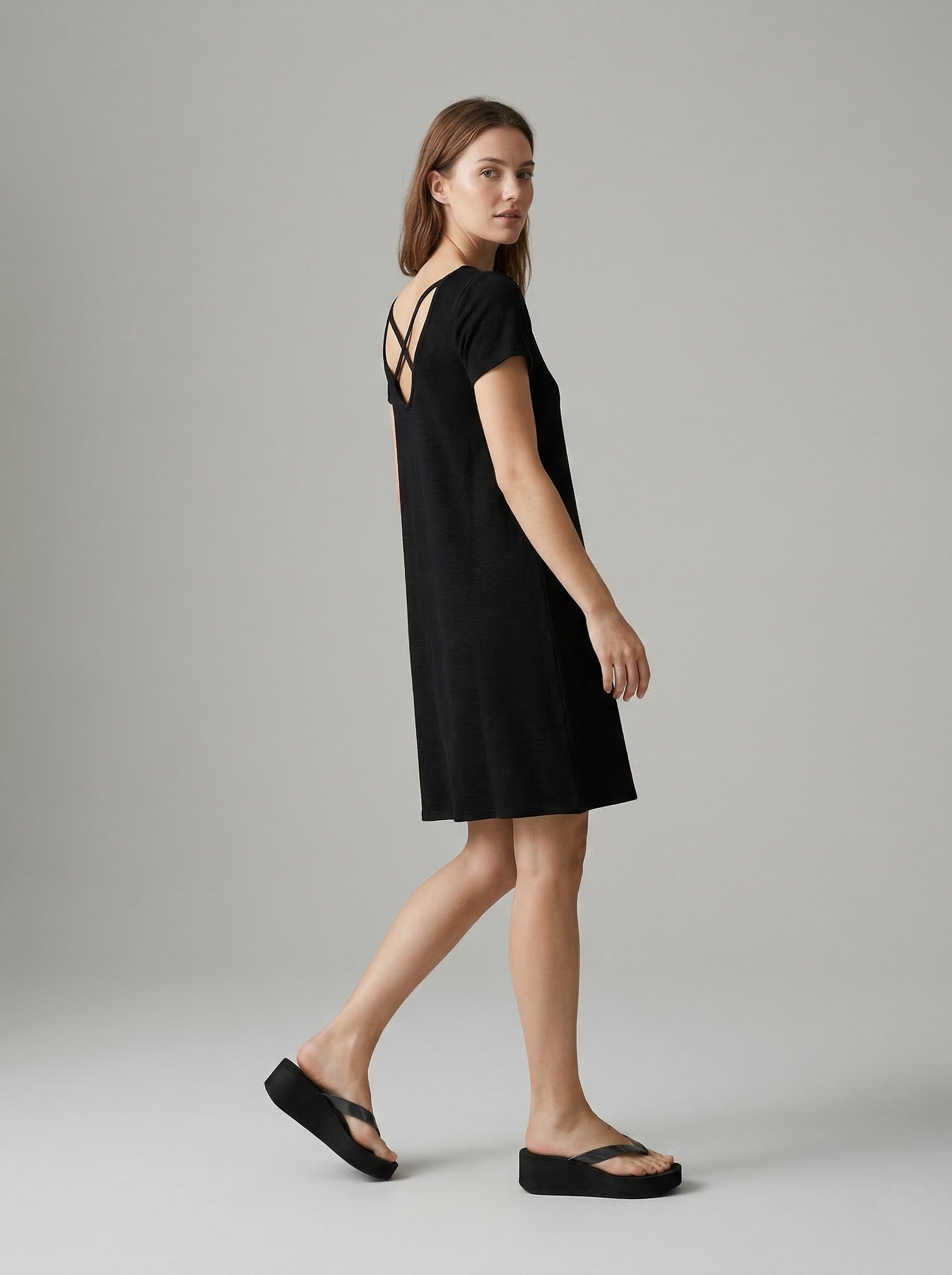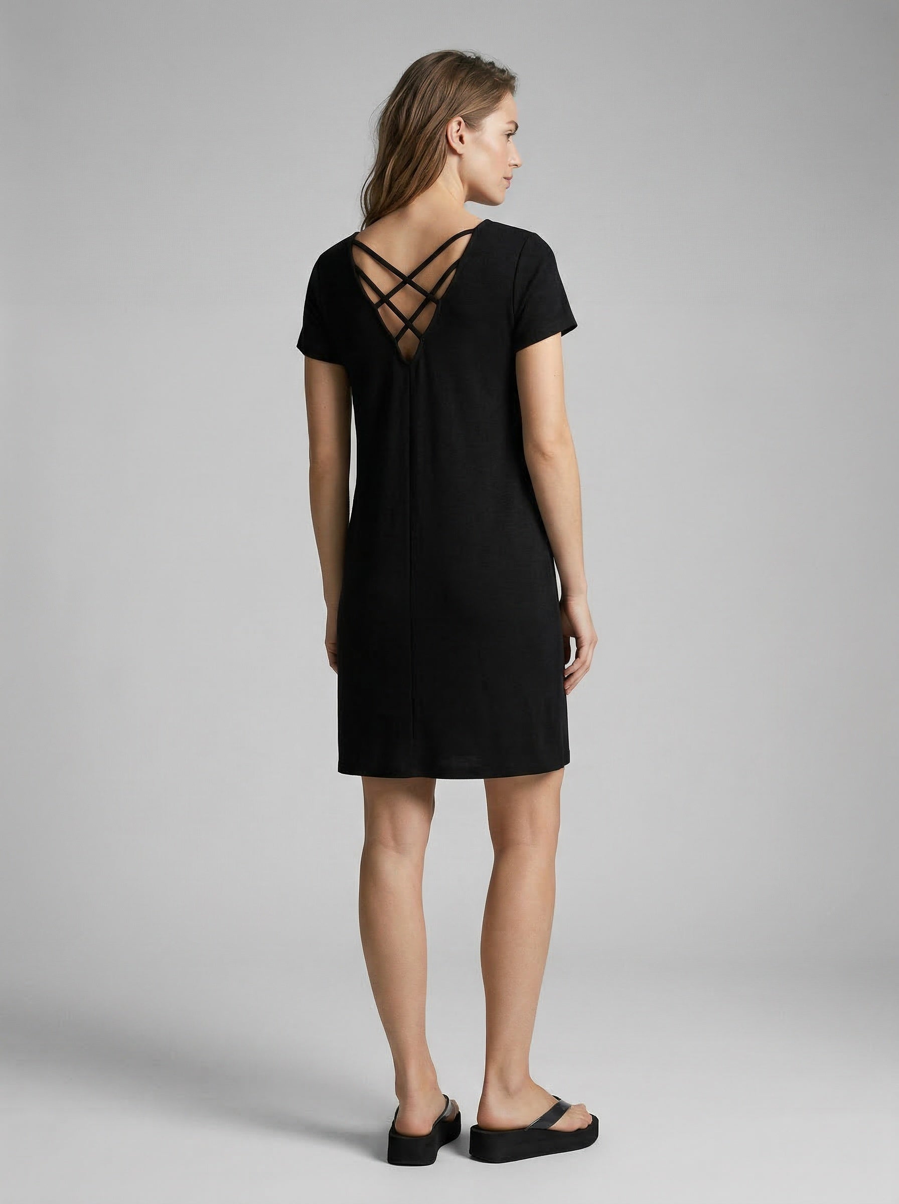 Μίνι φόρεμα σε ίσια γραμμή, με κοντό μανίκι, στρογγυλή λαιμόκοψη και λεπτομέρεια με άνοιγμα και χιαστί λουράκια πίσω.