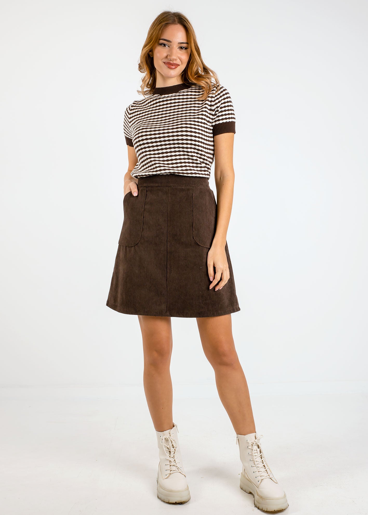 Μίνι φούστα ψηλόμεση από κοτλέ ύφασμα σε σκούρο καφέ χρώμα με τσέπες στα πλάγια.