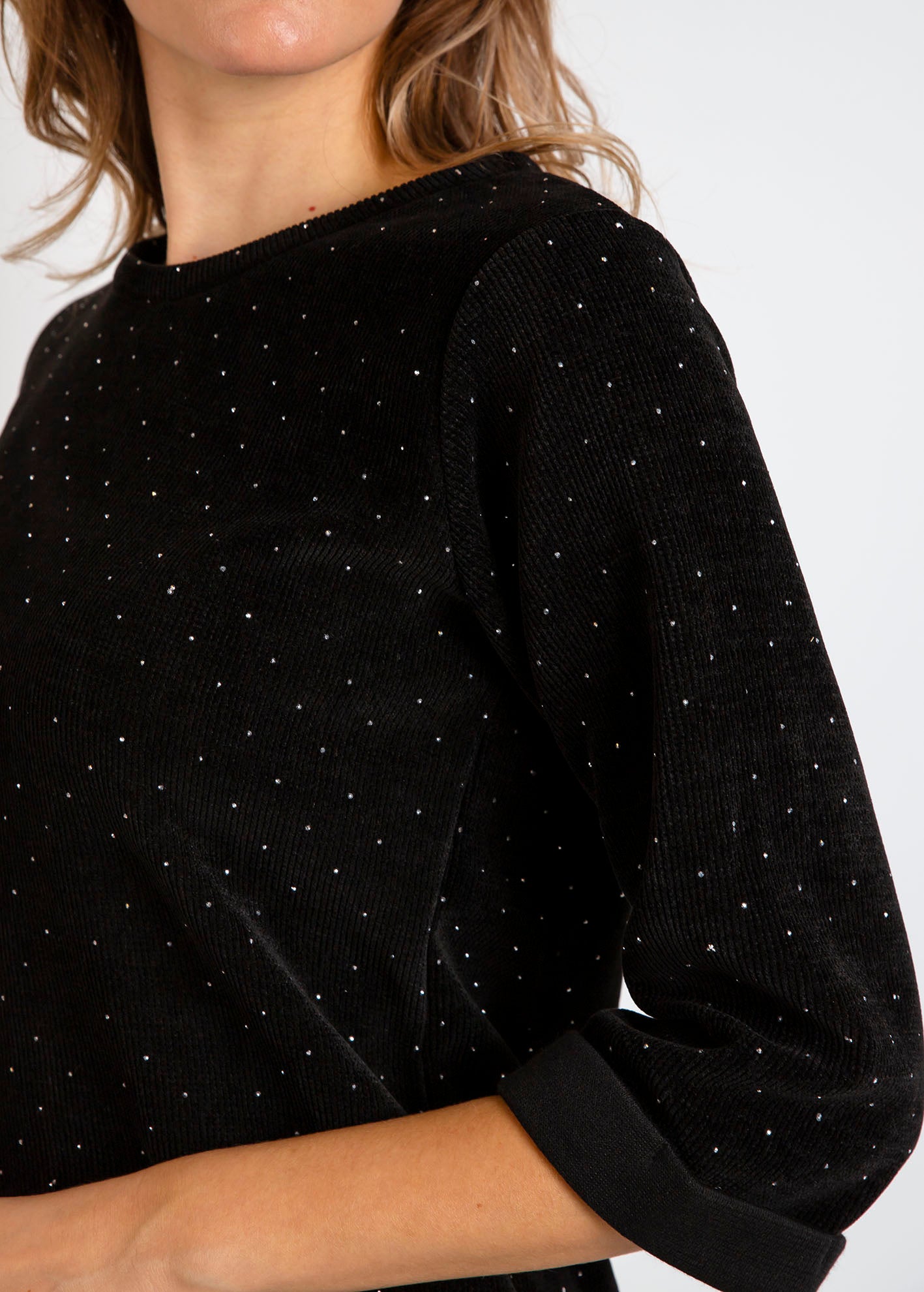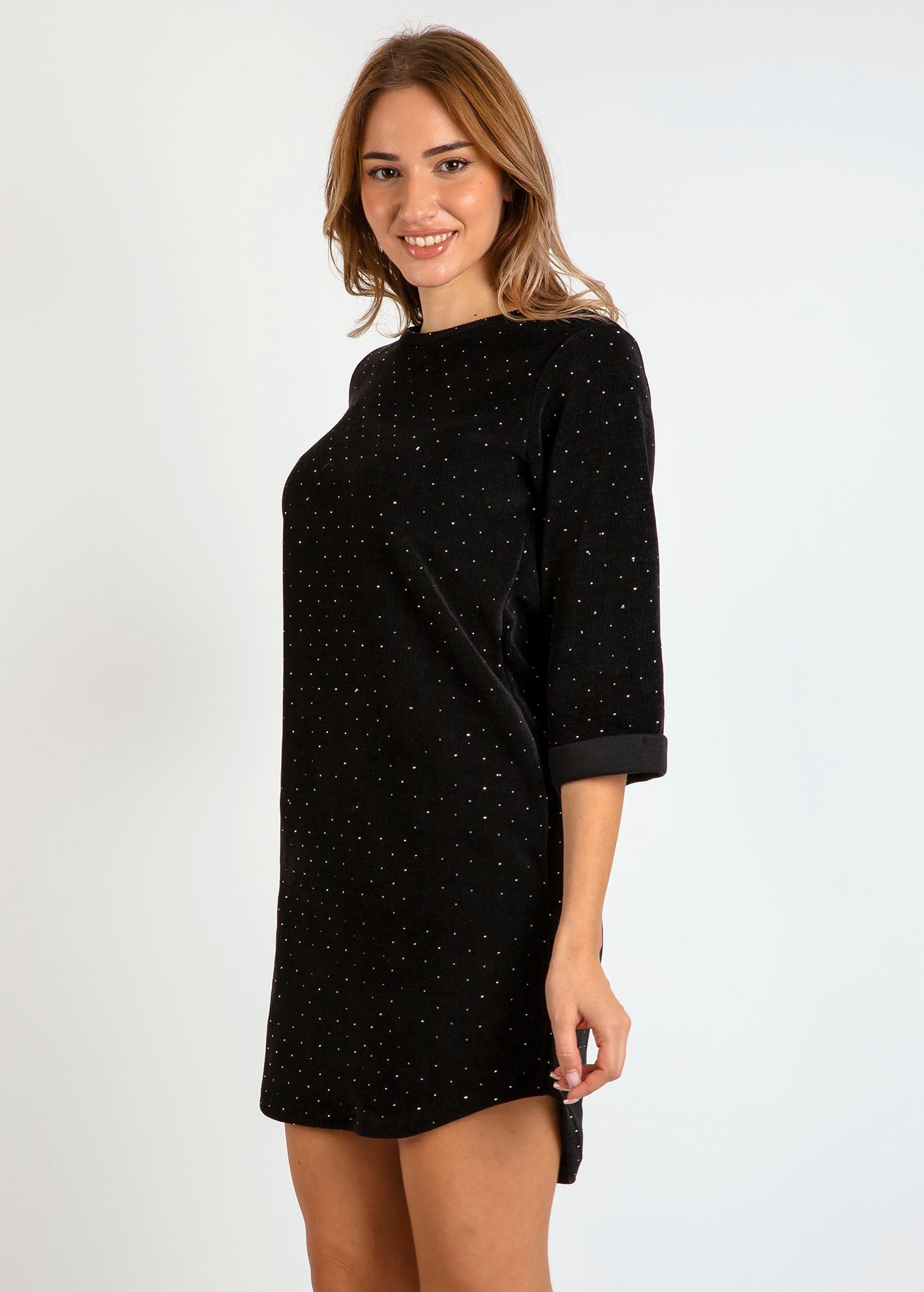Mini κοτλέ φόρεμα σε ίσια γραμμή με διακριτική γκλίτερ υφή σε όλη την επιφάνεια. Στρογγυλή λαιμόκοψη και 3/4 μανίκια με ρεβέρ, από απαλό ύφασμα με ελαστικότητα για άνετη εφαρμογή.