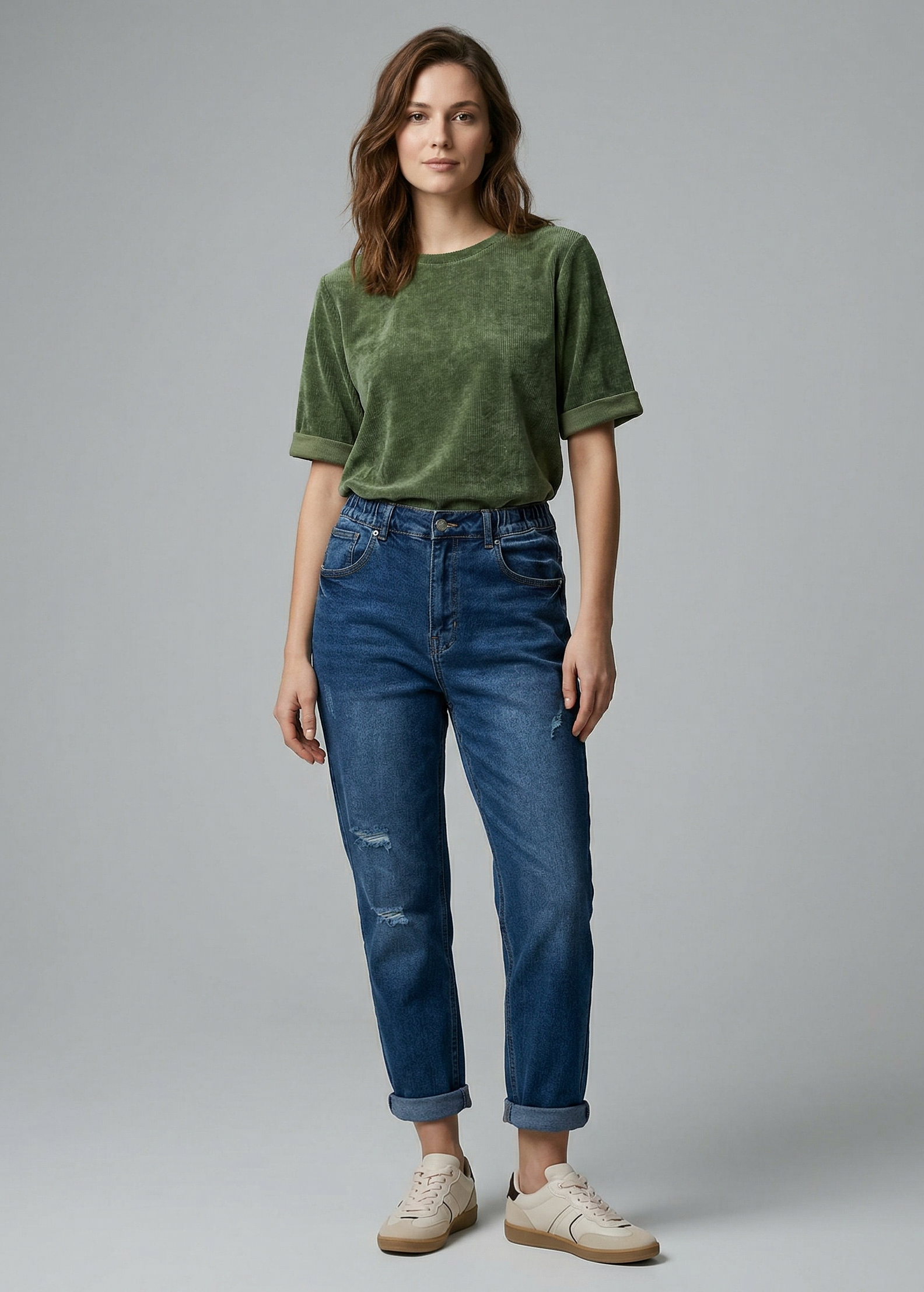 Ελαφριά μπλούζα με απαλή υφή, κοντό μανίκι και στρογγυλή λαιμόκοψη.