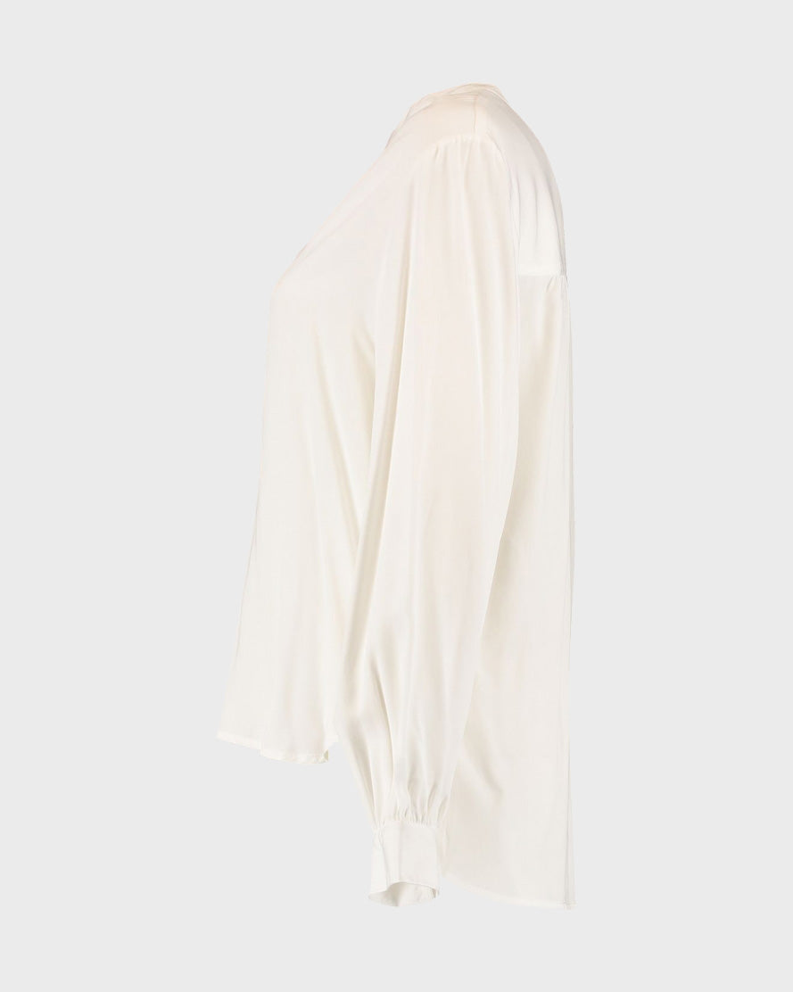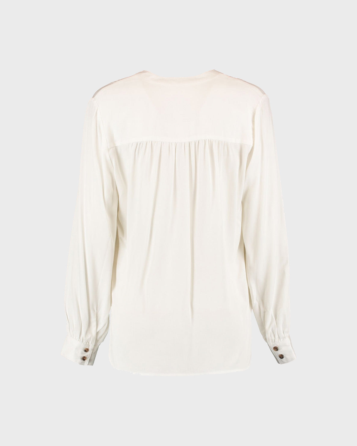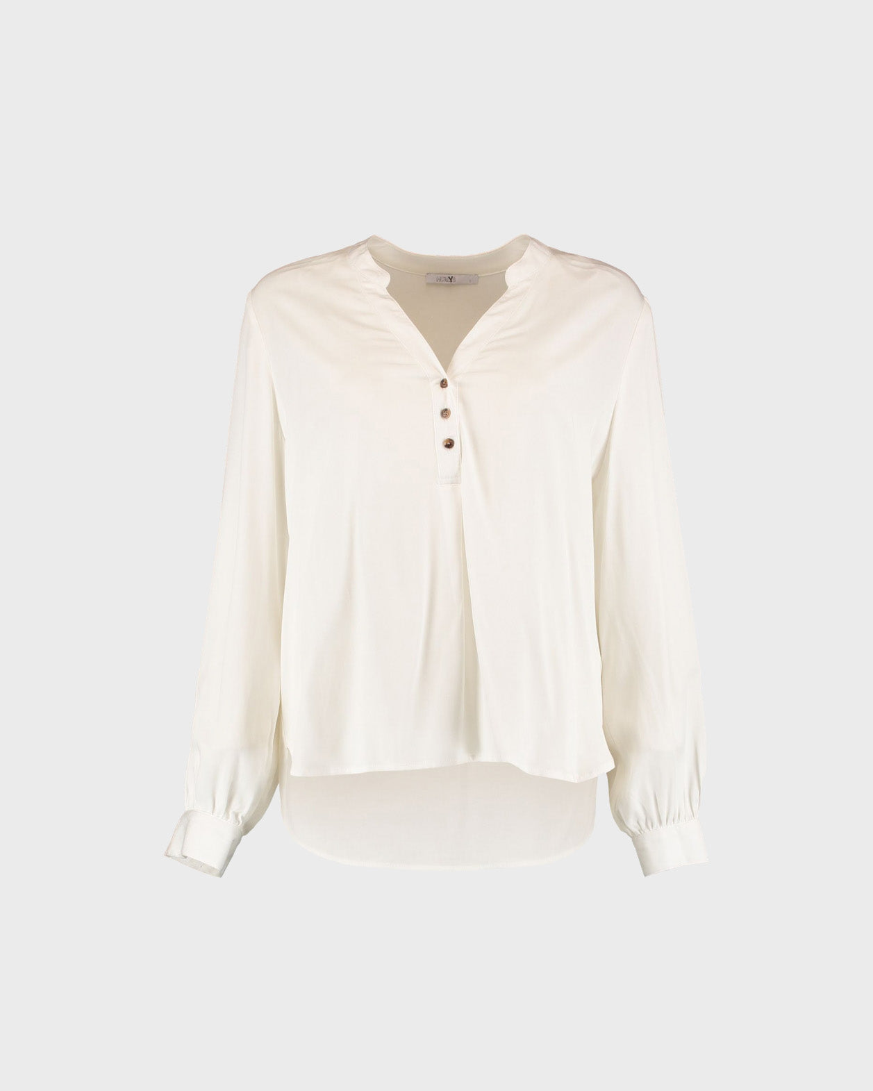 Ριχτή μπλούζα με V λαιμόκοψη, γιακά μάο και μακρύ μανίκι. Κλείσιμο μπροστά με κουμπάκια.