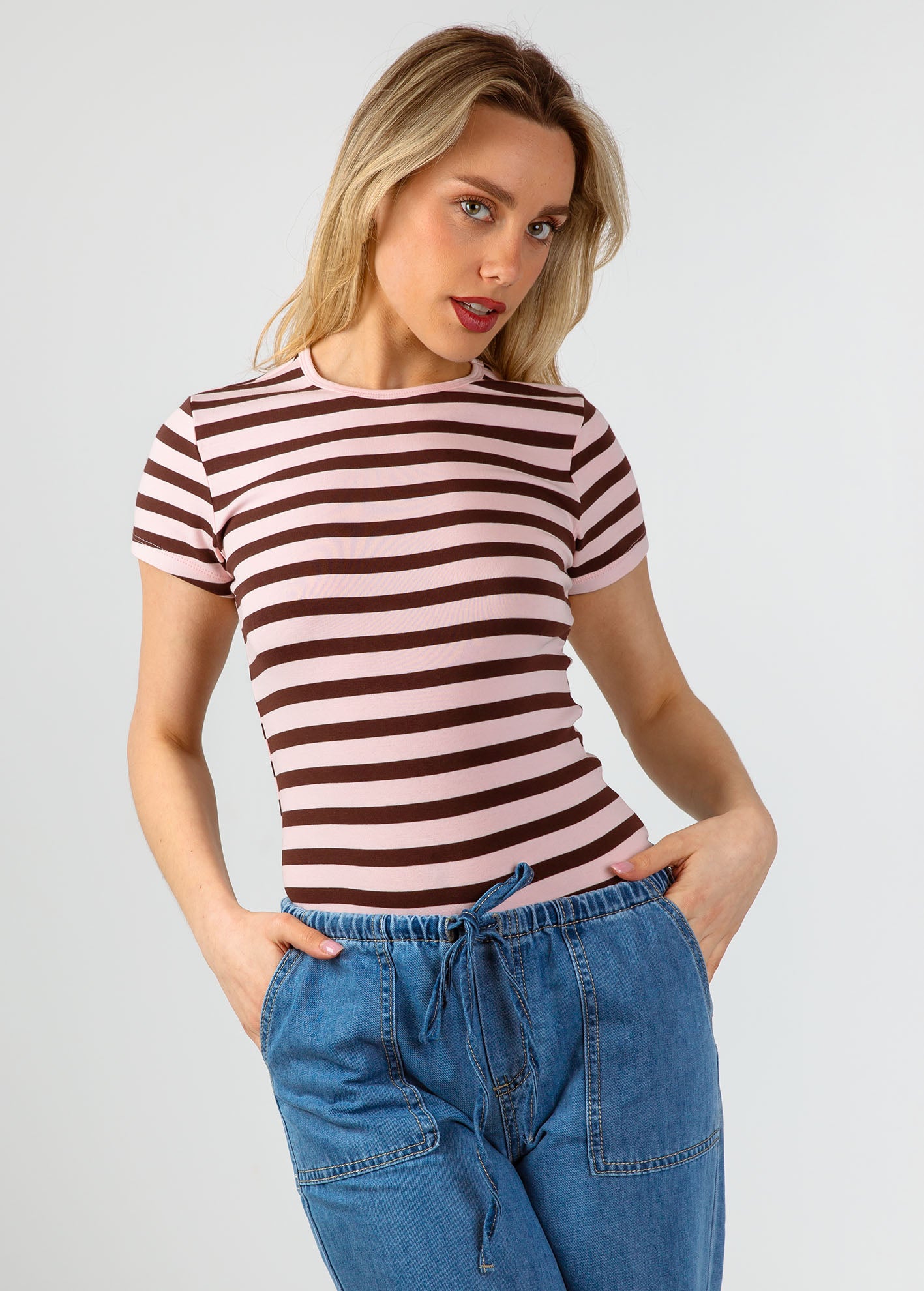 Γυναικείο ριγέ κοντομάνικο t-shirt 'Ka44ia'-ροζ
